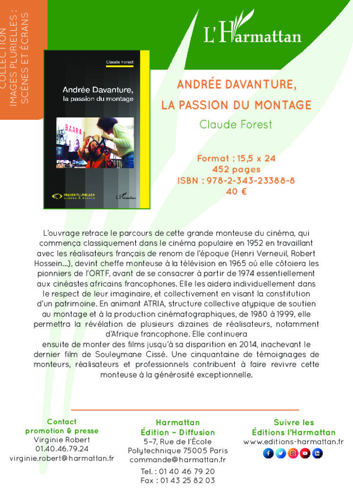 « L’ouvrage retrace le parcours de cette grande monteuse du cinéma, qui commença classiquement dans le cinéma populaire en 1952 en travaillant avec les réalisateurs français de renom de l’époque (Henri Verneuil, Robert Hossein…), devint cheffe monteuse à la télévision en 1965 où elle côtoiera les pionniers de l’ORTF, avant de se consacrer à partir de 1974 essentiellement aux cinéastes africains francophones. «